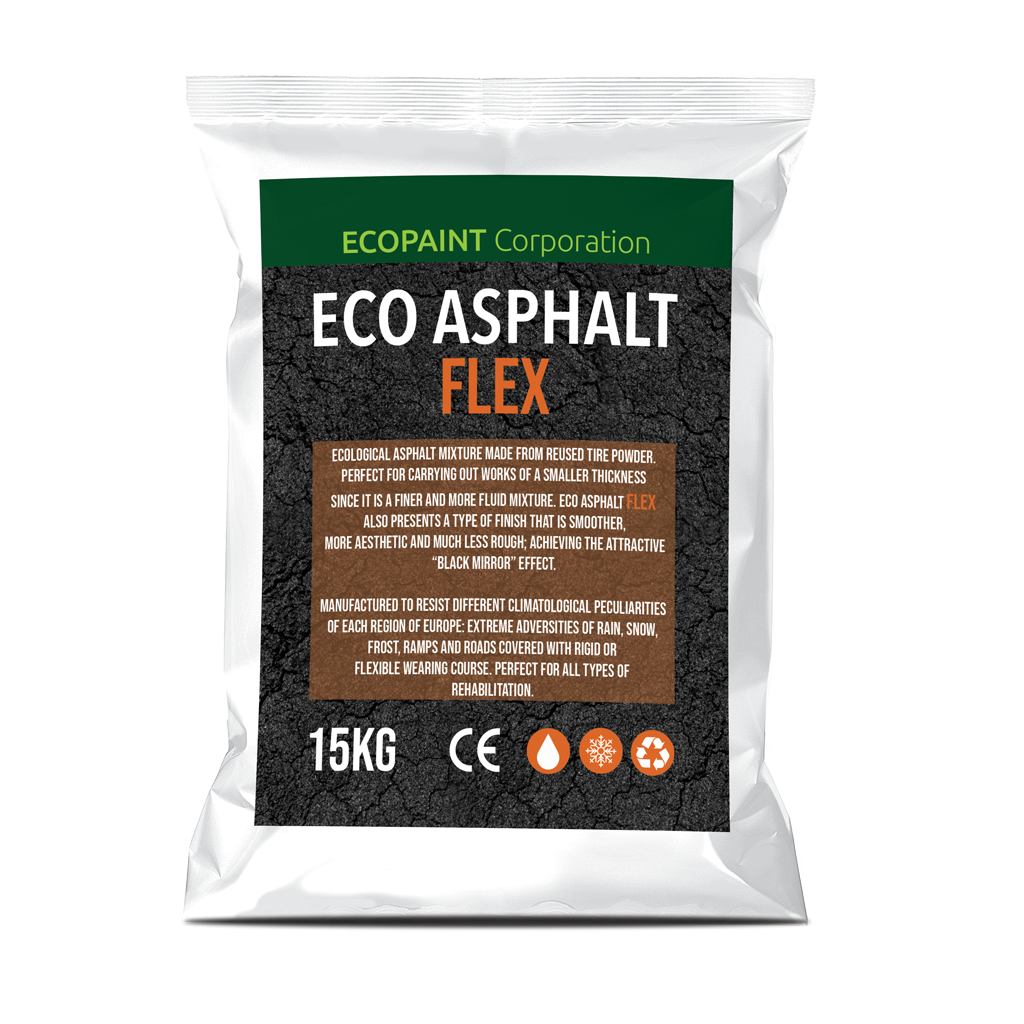 Ecological asphalt mixture made from reused tire powder. Perfect for carrying out works with a smaller thickness since it is a finer and more fluid mixture. Eco Asphalt FLEX also presents a type of finish that is smoother, more aesthetic, and much less rough; achieving the attractive “black mirror” effect.